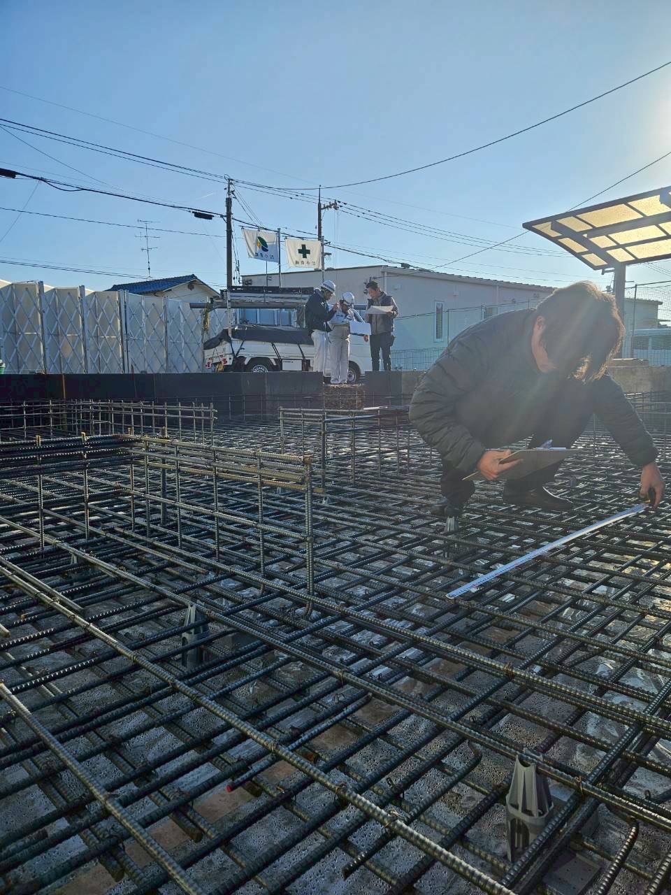 床掘が終われば次はコンクリートの中に入って見えなくなる『配筋』という細い鉄の棒を網上に組んで基礎の強度を保つために作っていきます。この網目状も決まった寸法があって20センチ間隔に均等に創っていきます。ちなみに鉄筋の下に見えるサランラップみたいなものは『防湿シート』といって地面の湿気が建物に入って如何にように土部分をビニールでカバーしています。
