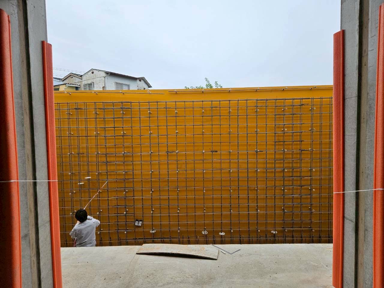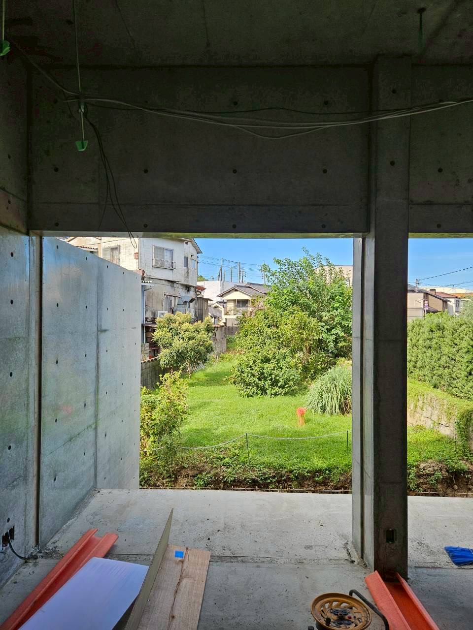 リビングから暖炉越しに見える風景になります・・・が!!!今回はこの借景を敢えてふさいでしまいコンクリートだけに囲まれた小宇宙を生み出します。その為の二回目のコンクリート打ちのため型枠工事が始まりました。