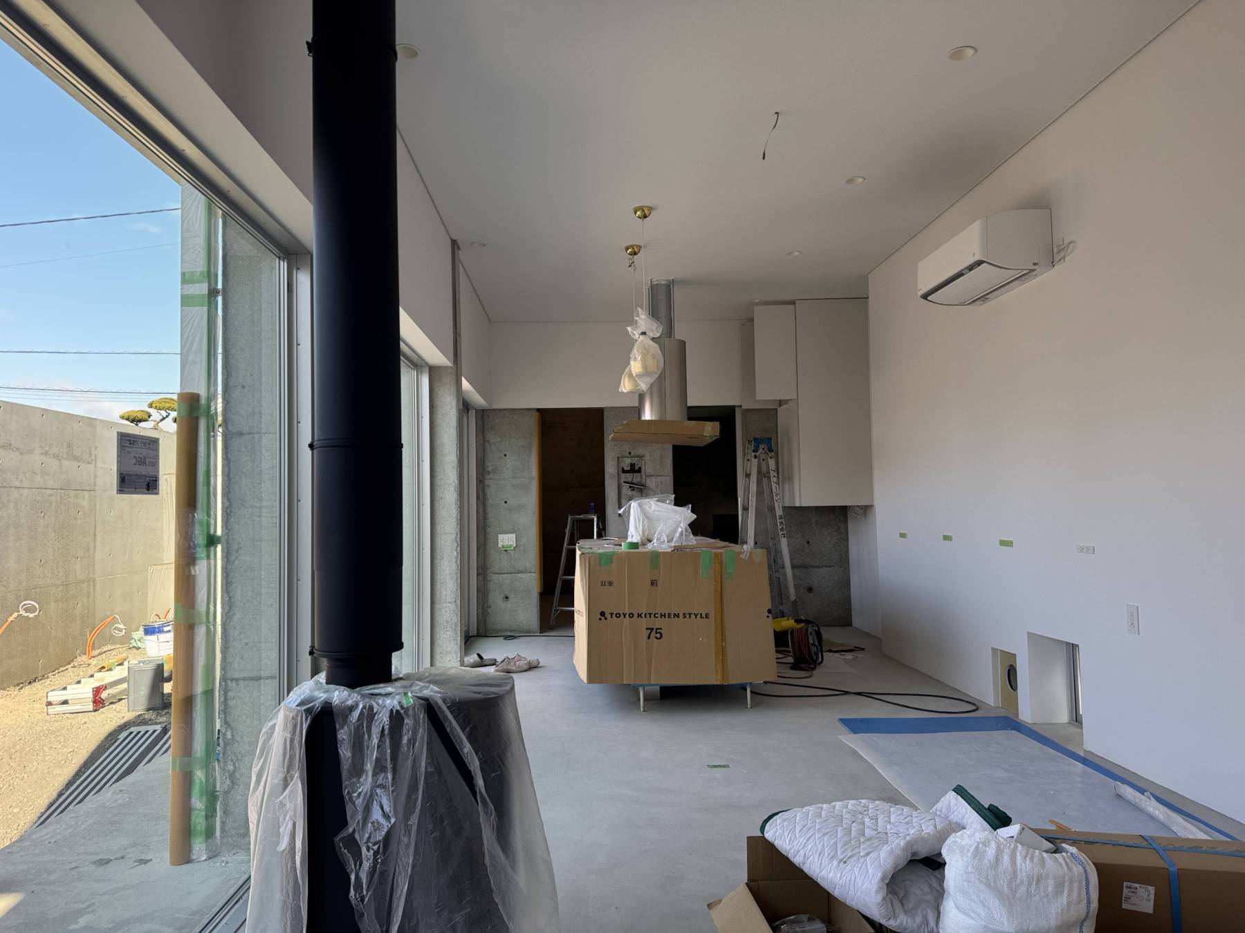 まだ仕上げていない骨組みの状態から段々仕上げられて行きお見せできる時には南北に設けられた大きな開口が印象的なワンルーム型LDKが仕上がっています。是非2026年1月17日+18日ご来場下さい。