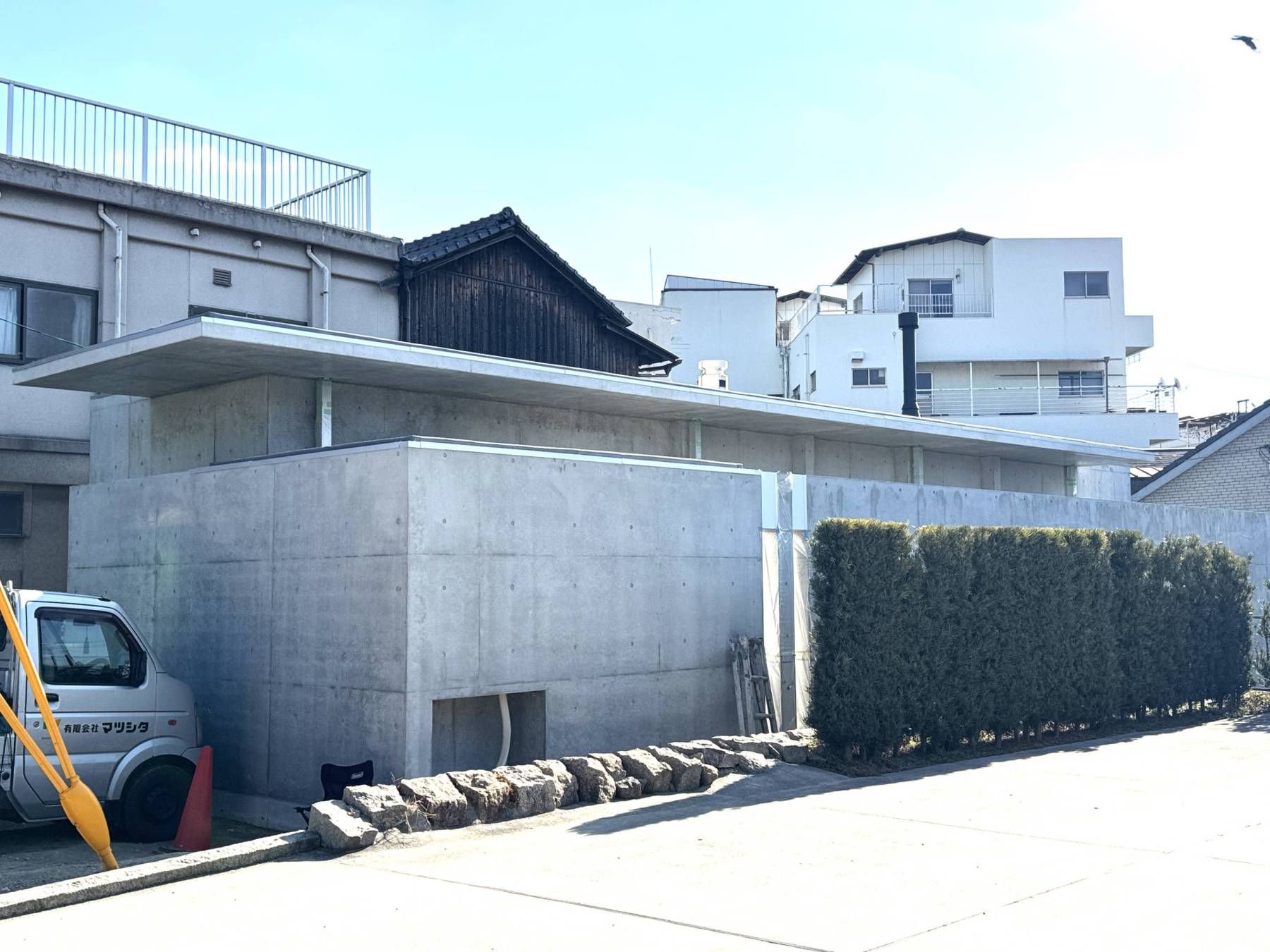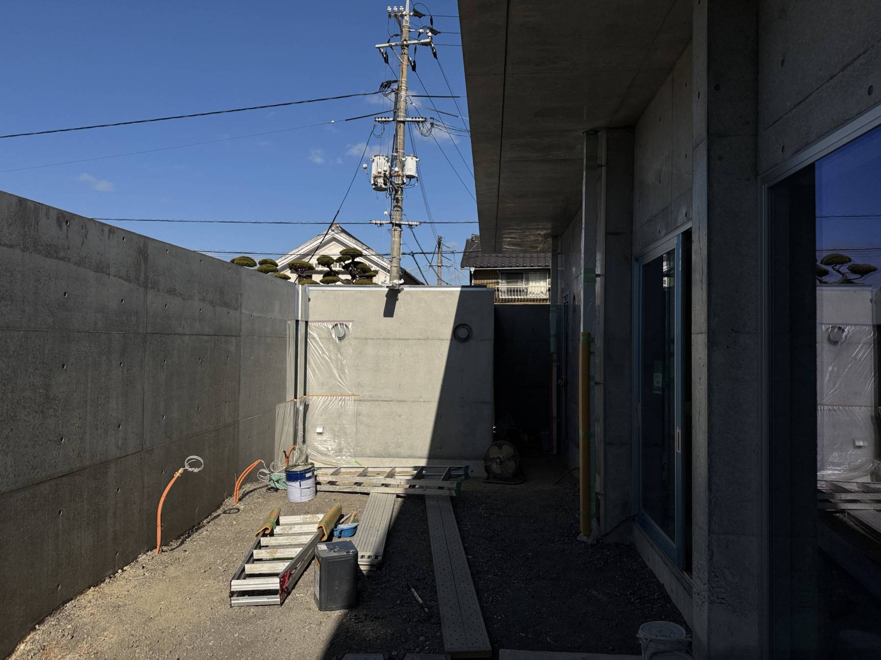 完成に近づいてきた玉島のコンクリート住宅。古い街並みの中にたたずむ平屋のミニマム住宅です。今回のコンクリート住宅は大きく庇を設けてテラス・玄関・通路に軒下空間を創りました。又、塀を外周ぐるりと設けて住み手だけのプライベート空間としてのテラスや母屋から話し手の離れ、敷地の高低差を活かしたレベルの異なる庭など限られた空間の中で盛りだくさんの設計手法を取り入れたことが特徴です。